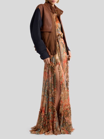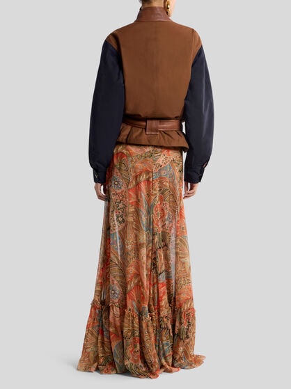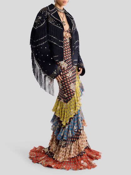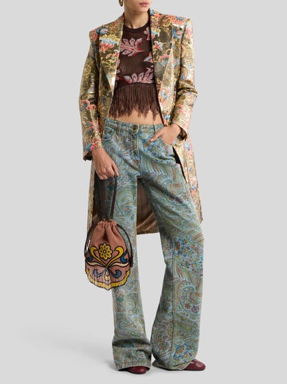 The ETRO women’s clothing collection encapsulates elegance and feminine style. Jacquard jackets in high quality fabrics are iconic in style with a feminine cut that highlights the silhouette, guaranteeing comfort and sophistication. The silk shirts with sinuous lines and well-finished details are coloured by Paisley designs while the palazzo trousers, with their width and fluid design, offer a feeling of lightness and style. Long dresses with floral prints capture the Maison’s quintessential style while short or wrap skirts featuring Pegaso embroidery add a touch of vivacity and dynamism to the wardrobe. Coats and outerwear with their elegant, contemporary design are a must-have. The Maison carefully selects high quality fabrics such as silk, cotton, linen, wool and cashmere. These fabrics make each garment in the collection an investment in style that lasts over time.