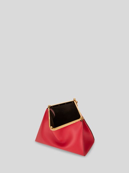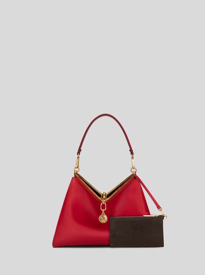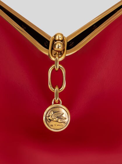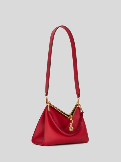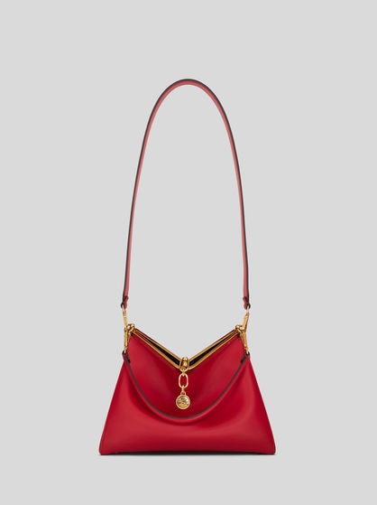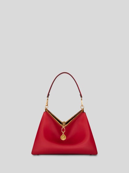 Designed by Marco De Vincenzo for ETRO, the Vela Bag in calfskin leather has an aerodynamic silhouette and a pointed section that evokes a sail design; distinctive by design, the bags are true works of art. The bags have the unique element of the V fastening, featuring a jointed zip that opens fluidly. The bags are enriched by a chain with a double-sided medallion with the ETRO and Pegaso logos, created using the same techniques for minting coins. The Vela Bag is available in classic colours such as black, ivory and gianduia, in addition to a variation of seasonal colours. The double detachable shoulder strap means that they can be worn either on the shoulder or as a crossbody. The Mini Vela Bag embodies the essence of sophisticated minimalism, the details add a touch of refined eclecticism, uniting their contrasting elements harmoniously. The ETRO Vela Bag can be worn with oversized coats or cocktail dresses.
