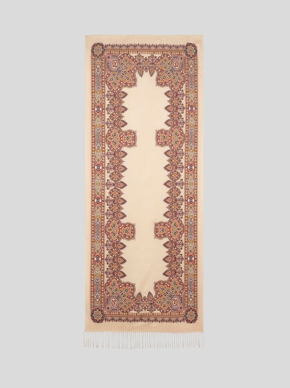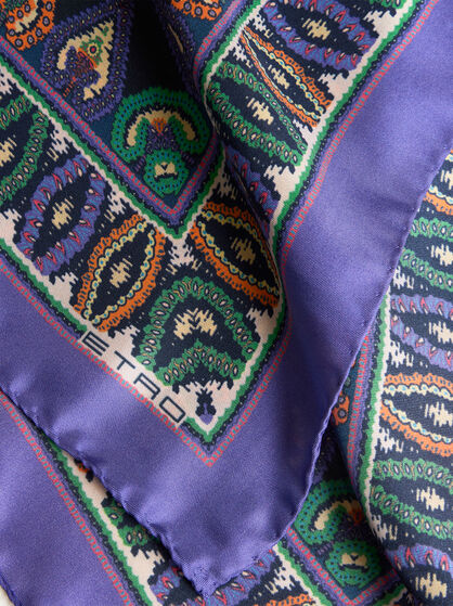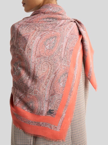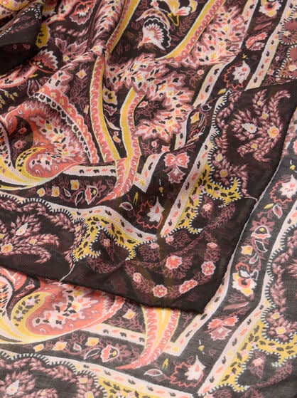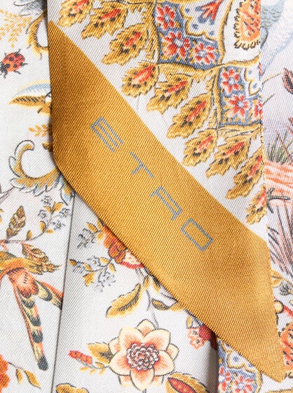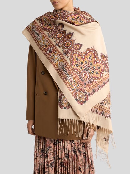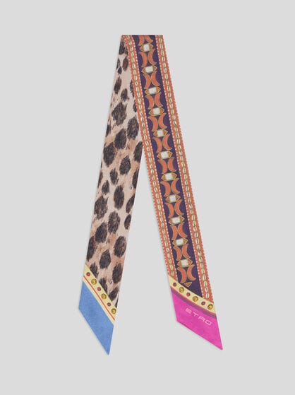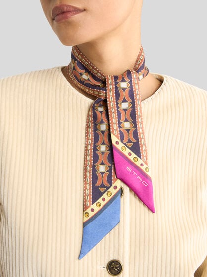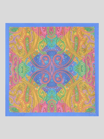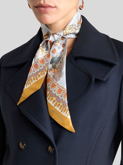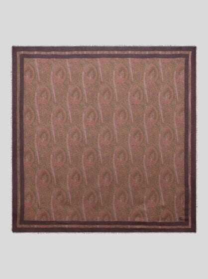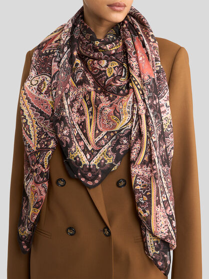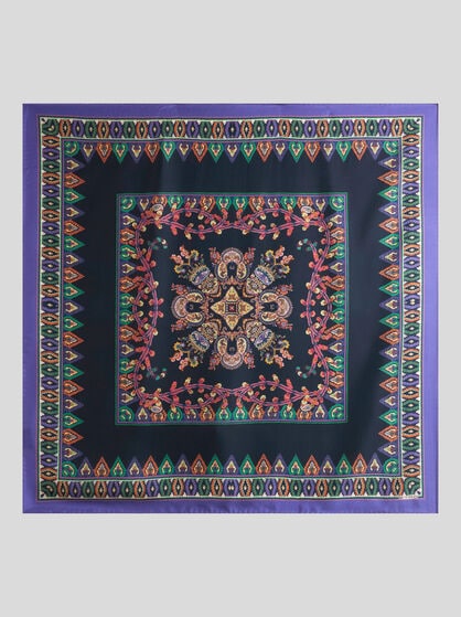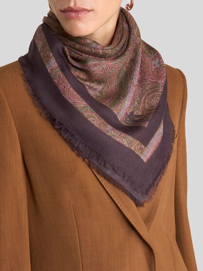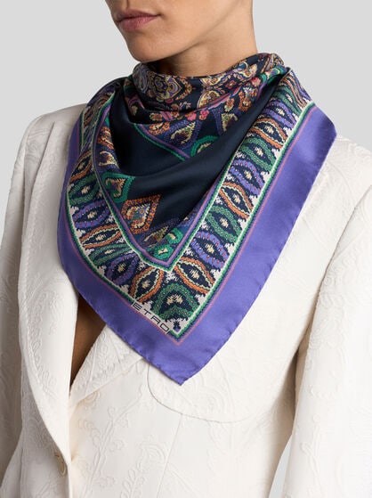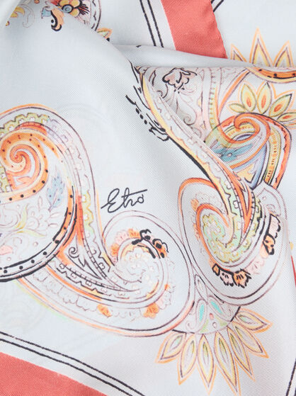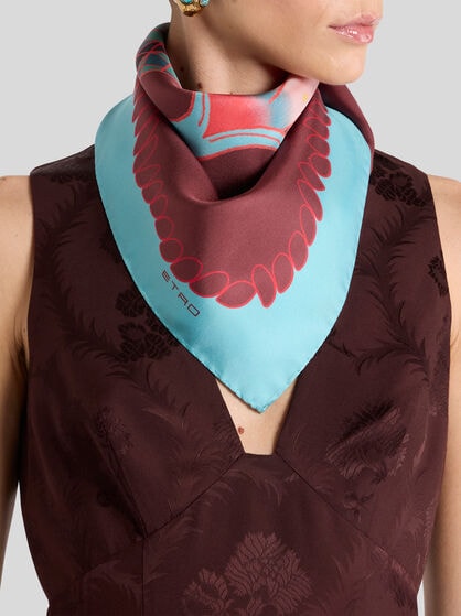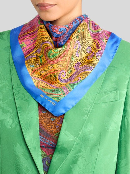 Explore the ETRO women's scarf collection. For a sleek and sophisticated look, use a soft silk scarf with an elaborate Paisley pattern, blending it with a light-coloured dress for a lively touch. For a casual-chic look, opt for a light, coloured scarf to tie around your neck or use as a hair band. Show off your style at its best by choosing a daring contrast or subtle co-ordination with the colours of your outfit. Tie a silk scarf to your favourite bag for a touch of elegance and personality, instantly transforming an everyday accessory into a truly unique look. Experiment with different scarf knotting techniques to create a variety of styles and adapt each piece to your unique personality. Renew your wardrobe with ETRO's iconic accessories and experiment with the multi-versatility of these alluring scarves and foulards.