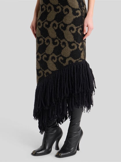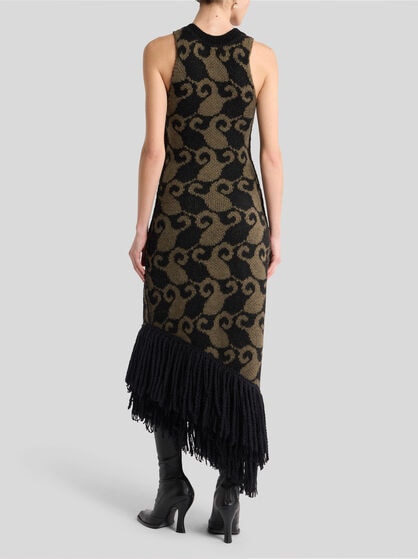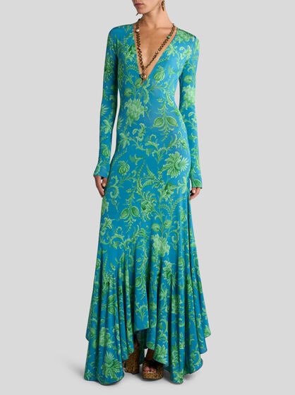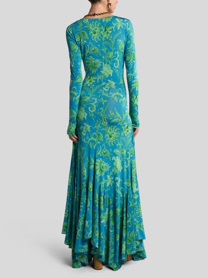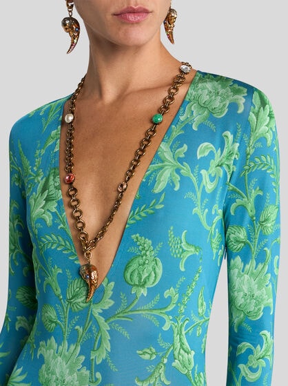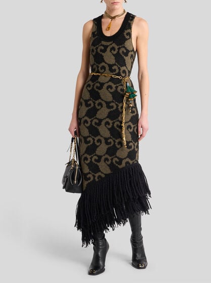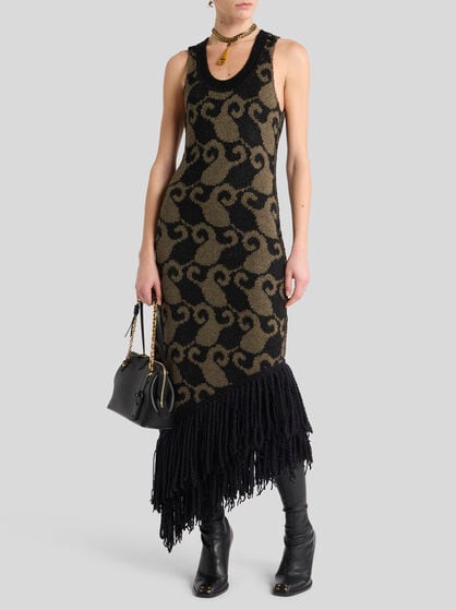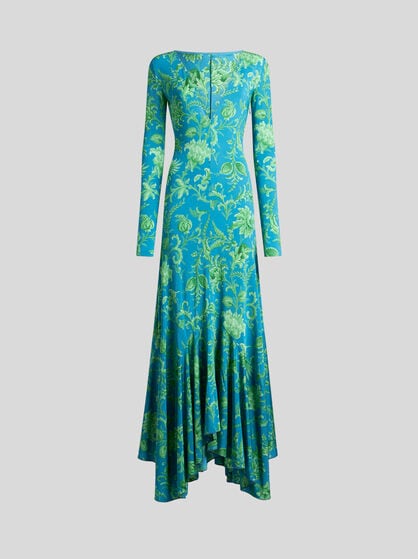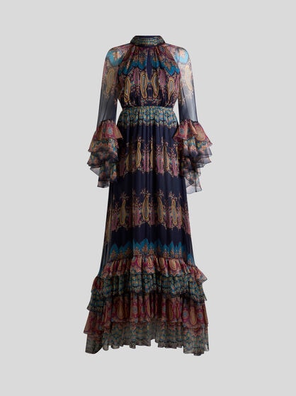 The dresses in the ETRO women’s collection are an authentic celebration of feminine beauty. Made in precious fibres such as silk and cotton, these garments elegantly come with floral prints, jacquard, patchwork and the iconic Paisley graphic, creating sophisticated and chic dresses. The collection offers a variety of models including long floral dresses that are perfect for special occasions, shirt dresses embellished by flounces to add a touch of elegance, and kimono models with an asymmetric cut, perfect as a passe-partout for any occasion. Ceremonial dresses, jumpsuits and evening dresses, elegant clothes that make every woman feel extraordinary. Explore our collection of women’s dresses, including the classic elegant sheath dress and tailored suits. Combine these dresses with your favourite accessories from handbags to the Saturno bag or Mini Vela bags.