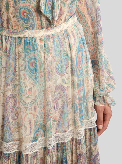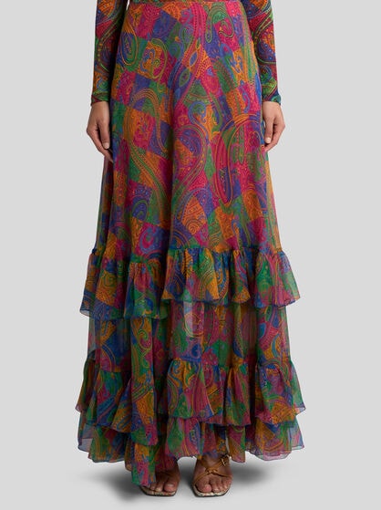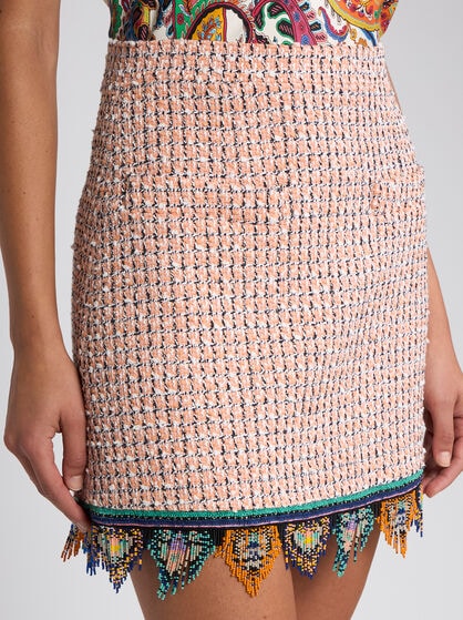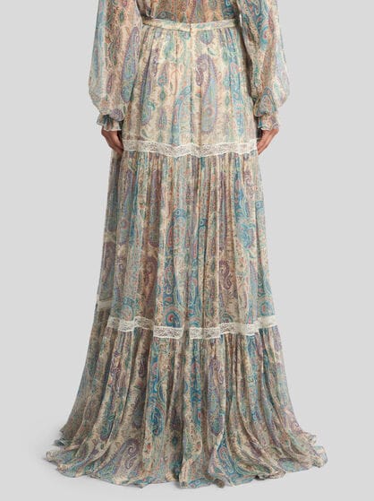 The ETRO skirt collection comes in a vibrant mix of fabrics, embroidery and patterns. ETRO wrap models are perfect for daywear while the jacquard weave, the elegant A-line skirts are suitable for the evening. Floral prints on silk and velvet adorn both long and mini skirts, giving the female figure a slender charm. The mini skirts feature Paisley patterns making them perfect for any occasion, whether it’s a day in the city or a ceremony. If you are looking for the perfect skirt for a wedding, long skirts offer truly alluring options. Shop a short satin skirt with ruche details for a touch of glamour. ETRO A-line skirts are a trendy alternative for people looking for versatility in their wardrobe but if you prefer a casual and fashionable style, the floral and denim skirts are ideal.