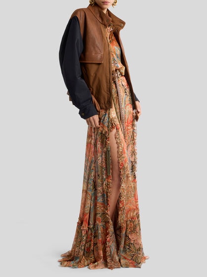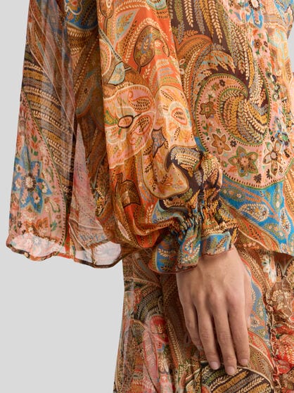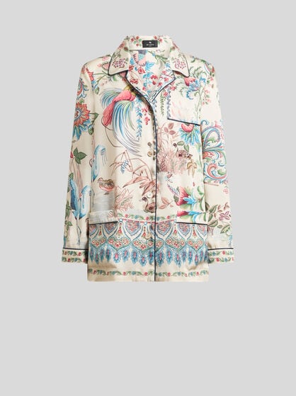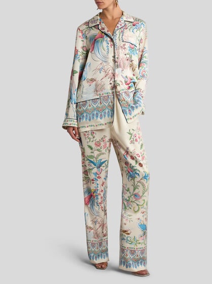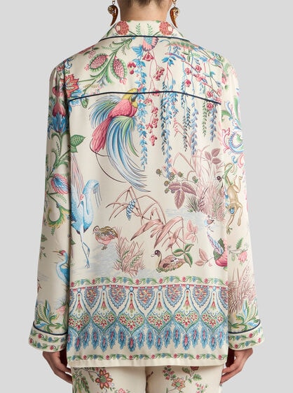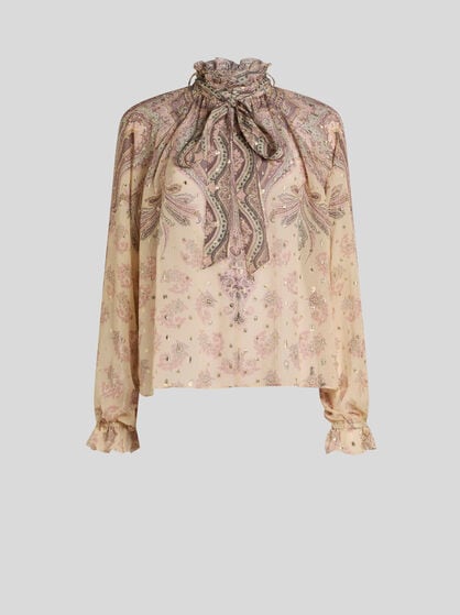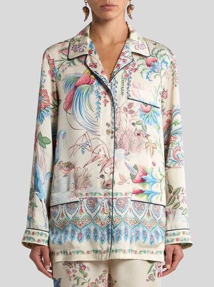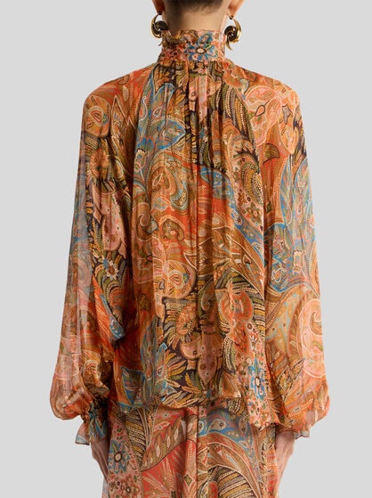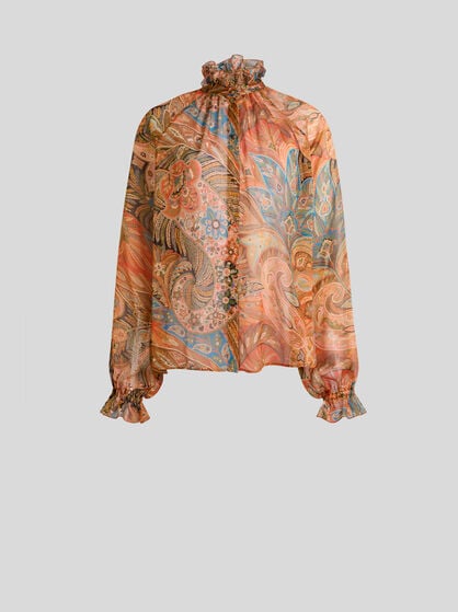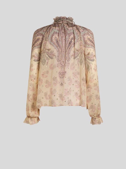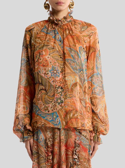 The women’s shirts by ETRO are the embodiment of femininity and elegance. The collections offer a wide range of unique patterns that combine in playful ways. Silk shirts take centre stage in a woman’s wardrobe; available in a variety of unique prints including stripes, polka dots, Paisley and floral prints. These refined fabrics come to life with details such as ruches, fringes and lace inserts adding a touch of sophistication to each garment. The extraordinary design of ETRO shirts includes options like short sleeves, perfect for hot days, and oversize shirts for a fashionable and comfortable look. Whatever the occasion, ETRO’s collection of women’s shirts blend perfectly with denim jeans, short skirts or flared trousers with their timeless beauty and sophistication.