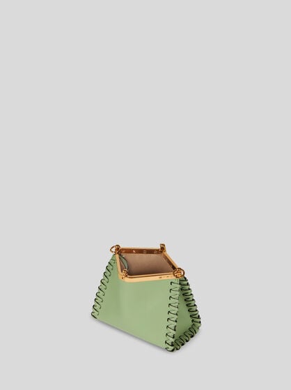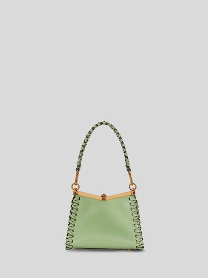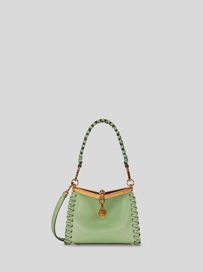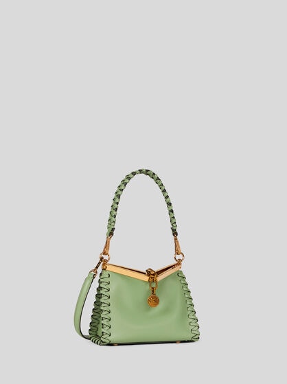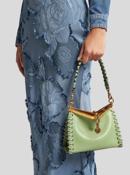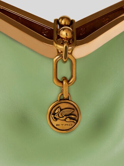 マルコ・デ・ヴィンチェンツォがデザインしたカーフレザーの新しいアイコンバッグ、ヴェラ。帆に着想を得たシャープで洗練されたシルエットや、V字型のメタルクロージャ―が特徴です。コイン鋳造と同じ技法で作られ、エトロのロゴが刻印されたメダル付のチェーンがあしらわれています。ヴェラは、ブラック、ベージュ、ブラウンといったベーシックカラーに加え、シーズンの新色も登場します。ロングとショートの2種類のショルダーストラップは取り外し可能で、ショルダーバッグとしてもクロスボディとしてもお使いいただけます。洗練されたミニマリズムのエッセンスを表現したミニヴェラは、洗練されたディテールと対照的な要素が見事に調和しています。オーバーサイズのコートからカクテルドレスまで、様々なスタイルを引き立てます。