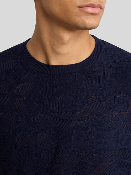 コットン100%のクルーネックセーター。フロントのディテールが個性的なデザイン。ネックライン、カフ、ヘムはリブ編み。
