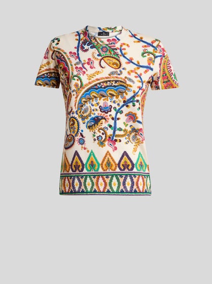 ETRO 스웨트셔츠와 티셔츠는 보다 더 현대적이고 아이코닉한 패션 정신을 구현합니다. 클래식한 룩을 연출하는 스트라이프 티셔츠, 우아함을 더하는 3/4 길이 소매의 티셔츠, 시대를 초월한 활용도를 자랑하는 단색 티셔츠 등 다양한 컬렉션을 만나보세요. 실크 디테일의 여성용 티셔츠는 우아함의 상징이며, 반소매 티셔츠, 러치, 플로럴 패턴 또는 매혹적인 패치워크 모델로 경쾌한 분위기를 연출해 보세요. 신선함을 원하신다면 가죽 재킷과 빈티지한 느낌의 청바지와 완벽하게 어우러지는 플로럴 프린트 티셔츠를, 자카드 또는 플리세 스커트와 함께 여성스러움을 더할 수 있는 필수 아이템인 플로럴 스웨트셔츠를 선택하세요. ETRO 여성용 스웨트셔츠는 최고의 편안함과 스타일을 선보이며 라운드넥 또는 후드 중 선택하실 수 있습니다. 다양한 ETRO 티셔츠와 스웨트셔츠 컬렉션을 살펴보고 모던하고 아이코닉한 스타일에 포인트를 더해 보세요.
