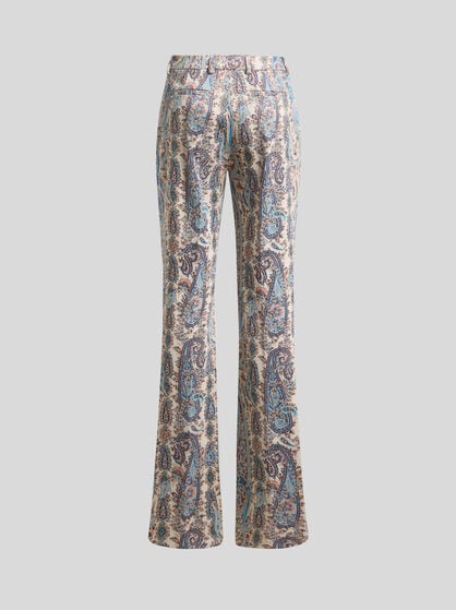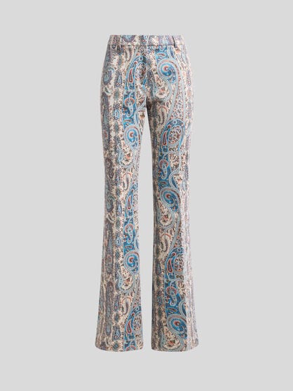 ETRO women’s trousers are perfect for any style with their meticulous attention to detail and an array of colours. ETRO meets the needs of every woman - from sinuous palazzo trousers with vertical lines of stripes and polka dots to the contemporary floral print culottes. The wide range also includes jeans embroidered with Paisley and optical patterns, silk trousers with Paisley prints, ETRO shorts and check trousers for a refined but informal look. The collection offers trousers with side bands, floral prints, patchwork and jacquard for a touch of elegance, perfect if you are looking for something unique. These can be combined with ETRO silk jackets for an elegant, sophisticated outfit. Choose from a selection of flared or straight trousers. Explore our collection and find the perfect trousers for your looks to combine with embroidered tops, T-shirts or Paisley silk blouses.