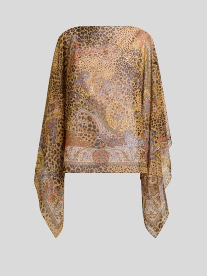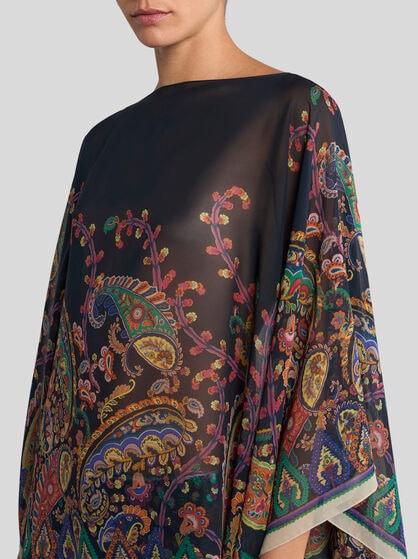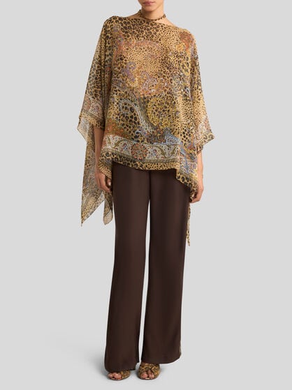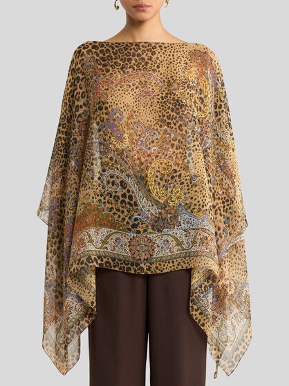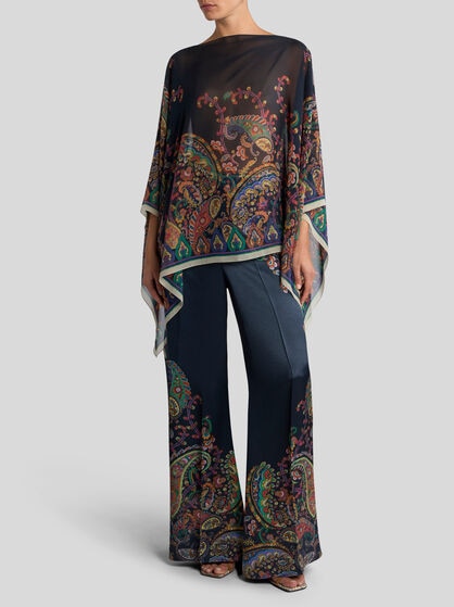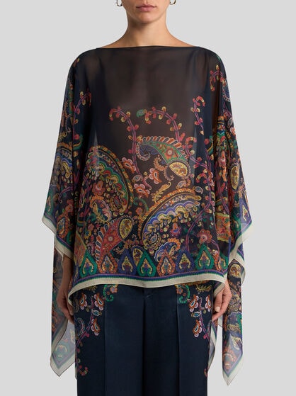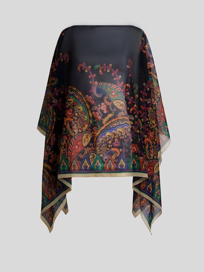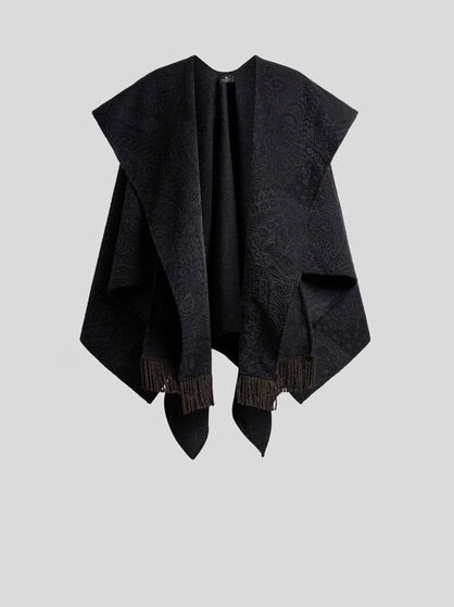 ETRO women’s capes and ponchos are made with fine yarns like cashmere and wool without overlooking silk or grosgrain details. The capes are perfect as outerwear and are available in different variations: from the classic cape to the cashmere model, the poncho and the wool cape. Designed to ensure comfort and warmth in every situation, from everyday wear to special occasions. ETRO capes offer models that are adaptable to any occasion. ETRO ponchos embody a unique style: offered in intarsia with the Pegaso logo, embroidered, made on the jacquard loom or simply decorated with Paisley prints. Whether it’s a jacket or a butterfly model, each poncho adds a touch of allure to any look and perfectly pairs with evening or formal wear for grand evenings, or jeans and trousers for days in the city, with friends and at work.