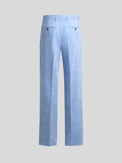The ETRO men's trouser collection consists of jeans, silk trousers and tailored jacquard trousers. Our cotton Paisley-print trousers are the very embodiment of ETRO elegance, while slim-fit jeans with embroidery add a modern touch when paired with our beautiful jackets. If you're looking for a touch of originality, opt for oversized trousers with printed and striped patterns, which will give your look an unparalleled uniqueness, especially when paired with printed sweatshirts. For a sophisticated ensemble, we recommend matching ETRO trousers with matching jackets. Silk or wool trousers are the ideal choice for formal events, while flared trousers with pleats add a touch of glamour to your everyday style. If you prefer a casual look, long cotton trousers are perfect for leisure time and go perfectly with leather jackets or trench coats.