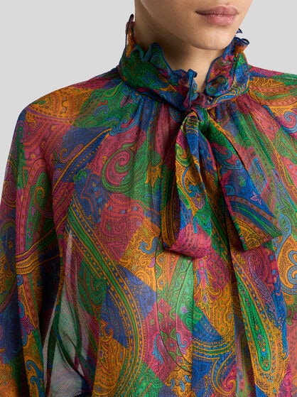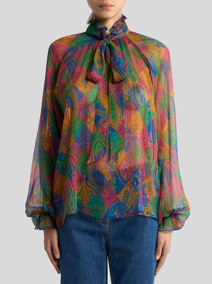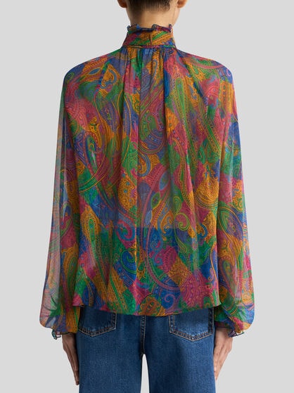 The women’s shirts by ETRO are the embodiment of femininity and elegance. The collections offer a wide range of unique patterns that combine in playful ways. Silk shirts take centre stage in a woman’s wardrobe; available in a variety of unique prints including stripes, polka dots, Paisley and floral prints. These refined fabrics come to life with details such as ruches, fringes and lace inserts adding a touch of sophistication to each garment. The extraordinary design of ETRO shirts includes options like short sleeves, perfect for hot days, and oversize shirts for a fashionable and comfortable look. Whatever the occasion, ETRO’s collection of women’s shirts blend perfectly with denim jeans, short skirts or flared trousers with their timeless beauty and sophistication.