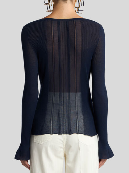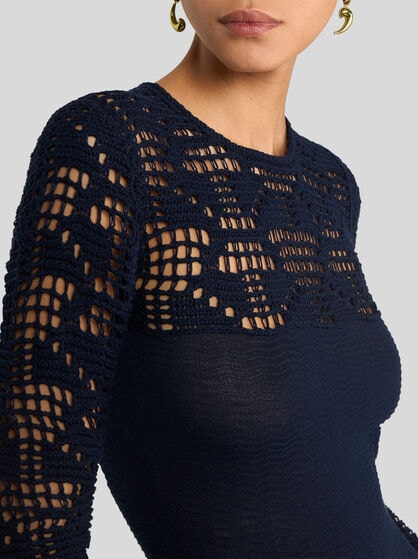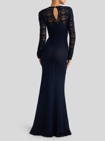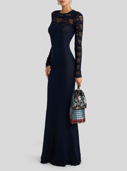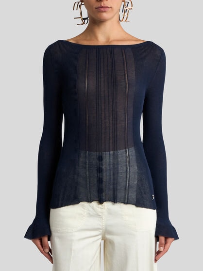 The ETRO women’s knitwear collection offers innovative styles in a world of colours. The cashmere and mohair wool jumpers are very carefully made ensuring utmost comfort and timeless style. The jacquard cardigans and jumpers in fabric are true works of art, perfect to wear with dresses or jacquard denim jeans and are embellished by fringes, embroidery and high-quality intarsia. The high-necked jumpers, combined with tailored trousers, feature floral Paisley prints, symbol of the ETRO brand while structured workings take centre stage in our collection. The women’s knitted gilet adds versatility to your wardrobe while the jumpers will envelop you in refined comfort. Complete your style with the jacquard cardigan, perfect for any occasion, also with printed and embroidered jumpers. Show off your personality with ETRO knitwear through its refined fabrics and colours.