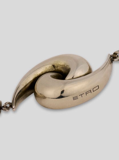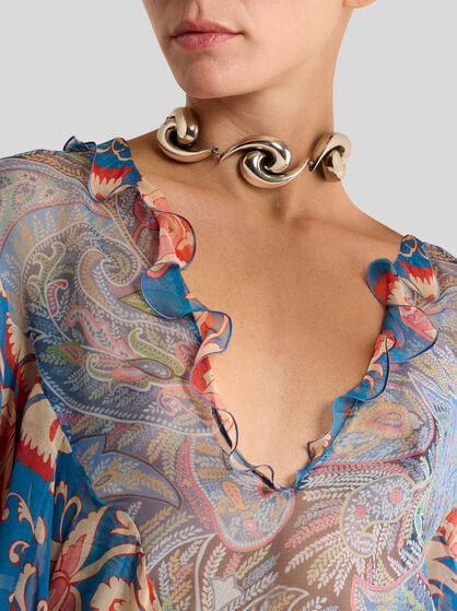 Discover the distinctive elegance of ETRO jewellery where natural beauty finds expression in earrings, capturing the grace of nature’s delicate shapes and maxi pendants that are embellished by intricate details. With their captivating design adorned by medals and charms, the degradé chokers stand out for their sophisticated style, embellishing every dress with a touch of timeless elegance. Wear the nature-inspired earrings with dresses in pale or neutral colours, like a light-coloured dress or blouse. The maxi pendants with fine embroidery can be combined with a dark, single colour dress or a simple shirt to enhance the look. The chokers match perfectly with elegantly cut simple dresses, like a sheath dress or a low-necked shirt. Instead, wear the bracelets embroidered with stones with an elegant but minimalist dress to allow the bracelet to shine as a distinctive element.