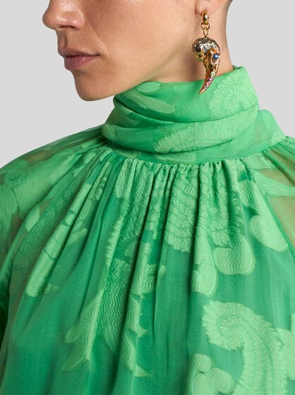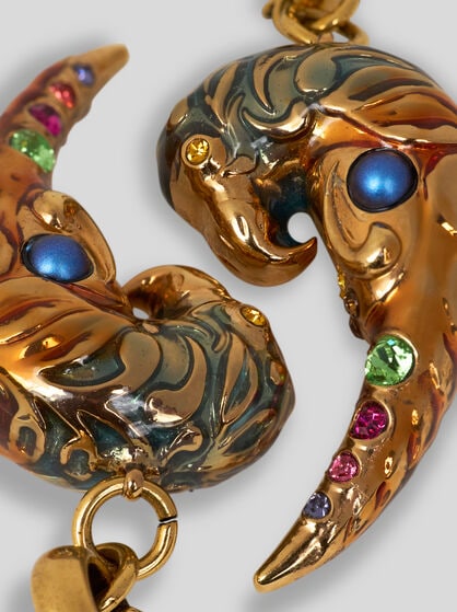 Discover the distinctive elegance of ETRO jewellery where natural beauty finds expression in earrings, capturing the grace of nature’s delicate shapes and maxi pendants that are embellished by intricate details. With their captivating design adorned by medals and charms, the degradé chokers stand out for their sophisticated style, embellishing every dress with a touch of timeless elegance. Wear the nature-inspired earrings with dresses in pale or neutral colours, like a light-coloured dress or blouse. The maxi pendants with fine embroidery can be combined with a dark, single colour dress or a simple shirt to enhance the look. The chokers match perfectly with elegantly cut simple dresses, like a sheath dress or a low-necked shirt. Instead, wear the bracelets embroidered with stones with an elegant but minimalist dress to allow the bracelet to shine as a distinctive element.