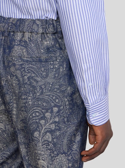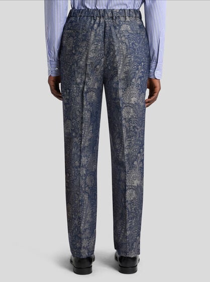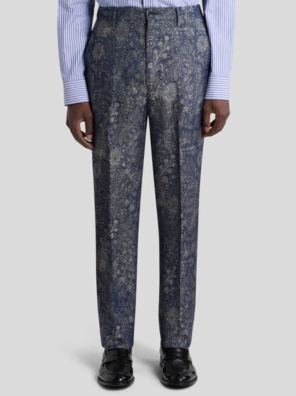 The ETRO men’s trousers collection consists of jeans, silk trousers and jacquard fabric tailored trousers. Our velvet and Prince of Wales check fabric trousers embody ETRO elegance while the slim fit jeans embroidery add a touch of modernity when paired with our splendid jackets. If you want a touch of originality, choose the oversize trousers with prints and striped patterns which will give your look unappareled uniqueness, especially if combined with printed sweatshirts. Why not combine the ETRO trousers with co-ordinated jackets for a sophisticated ensemble. Trousers in silk or wool are the perfect choice for formal events while flared versions with tucks add a touch of glamour to your everyday looks. If you prefer a casual look, the long cotton trousers are perfect for leisure time and perfectly match with leather jackets or trench coats.