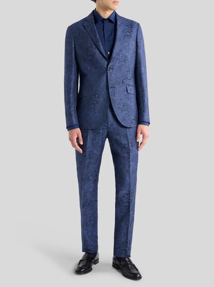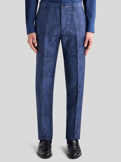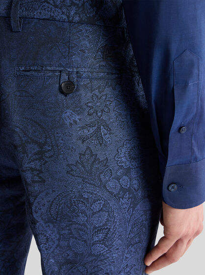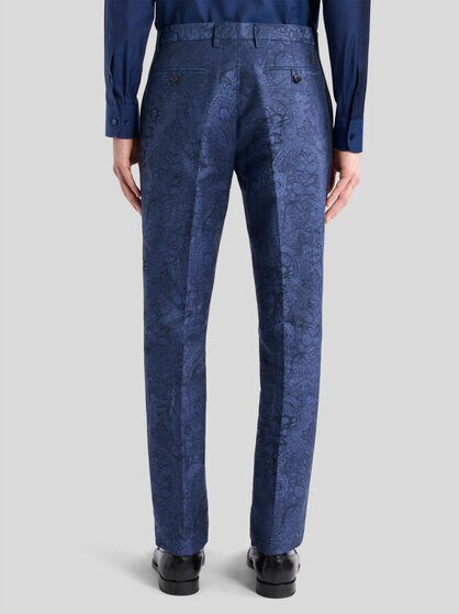 The ETRO men’s trousers collection consists of jeans, silk trousers and jacquard fabric tailored trousers. Our velvet and Prince of Wales check fabric trousers embody ETRO elegance while the slim fit jeans embroidery add a touch of modernity when paired with our splendid jackets. If you want a touch of originality, choose the oversize trousers with prints and striped patterns which will give your look unappareled uniqueness, especially if combined with printed sweatshirts. Why not combine the ETRO trousers with co-ordinated jackets for a sophisticated ensemble. Trousers in silk or wool are the perfect choice for formal events while flared versions with tucks add a touch of glamour to your everyday looks. If you prefer a casual look, the long cotton trousers are perfect for leisure time and perfectly match with leather jackets or trench coats.