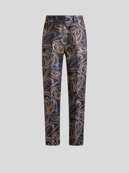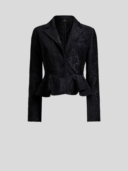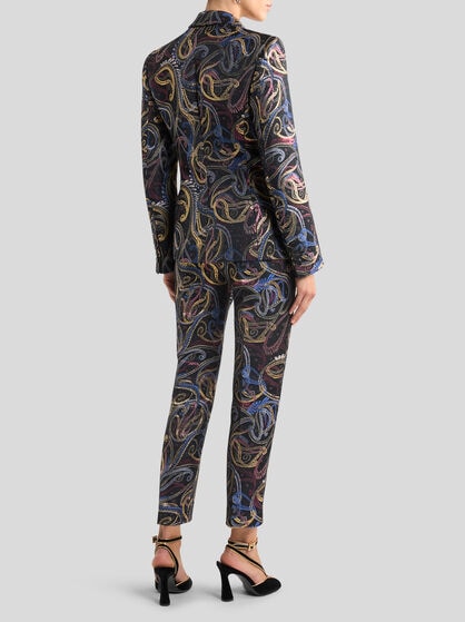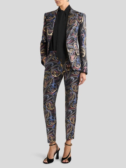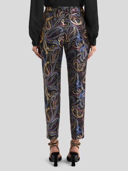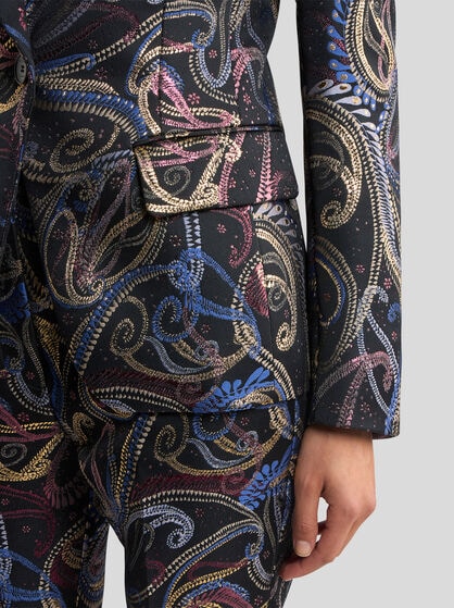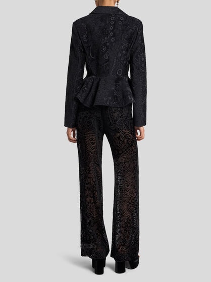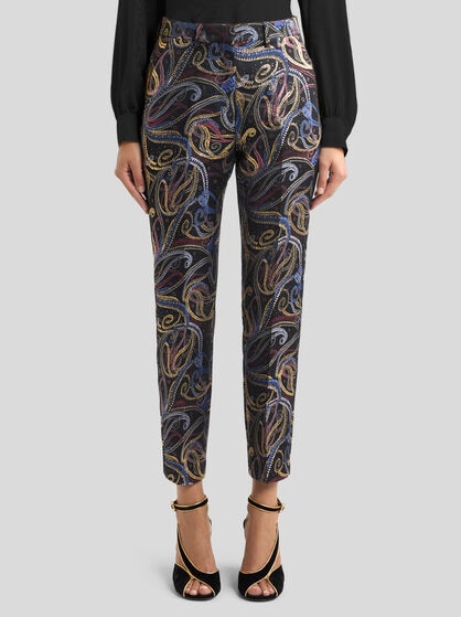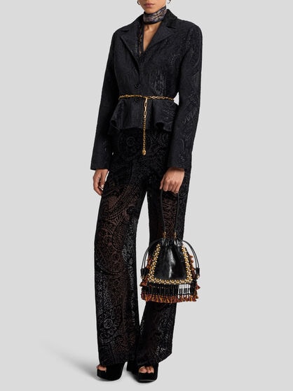 Paisley patterns are reimagined in jewel tones. Velvets and silks drape effortlessly. Lace, ruffles, and dazzling yarns weave a textural magic, accentuated by sophisticated embroidery and jacquard motifs. Accessories include unique pieces of intricate craftsmanship, such as the Vela Bag adorned with leather maxi paillettes and the Kalispera Bag with beaded fringes and braided details.