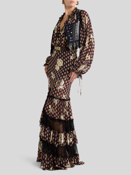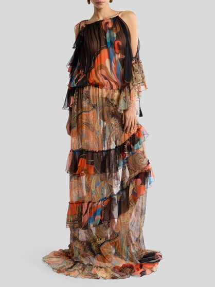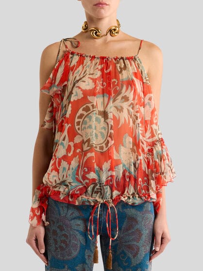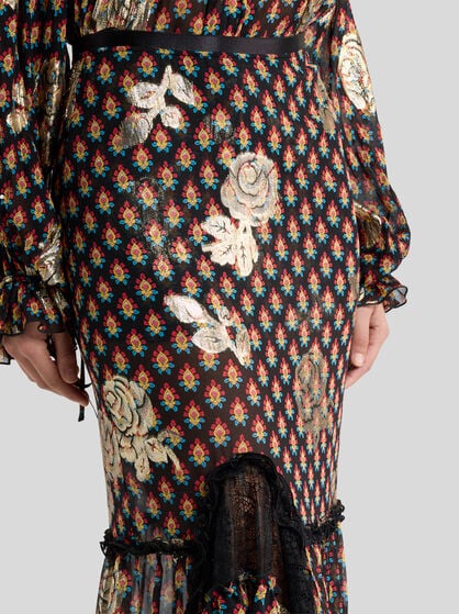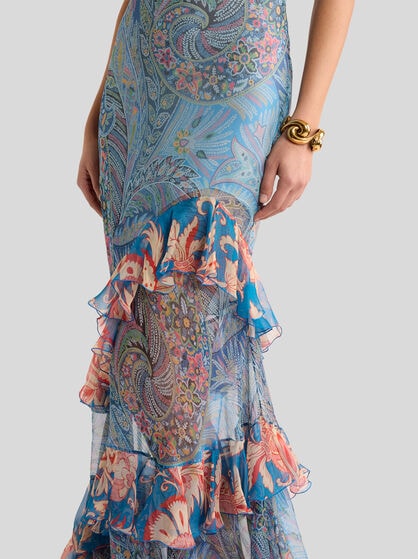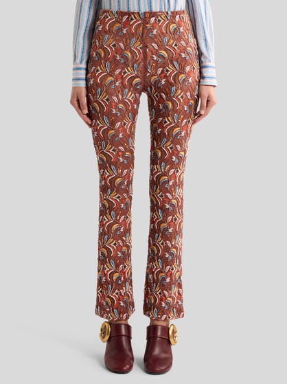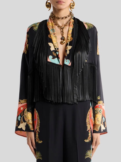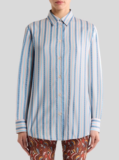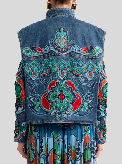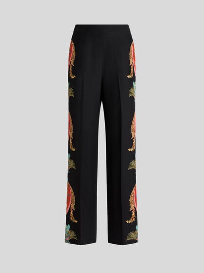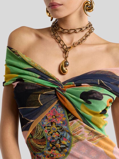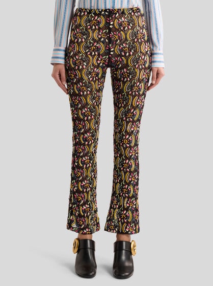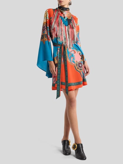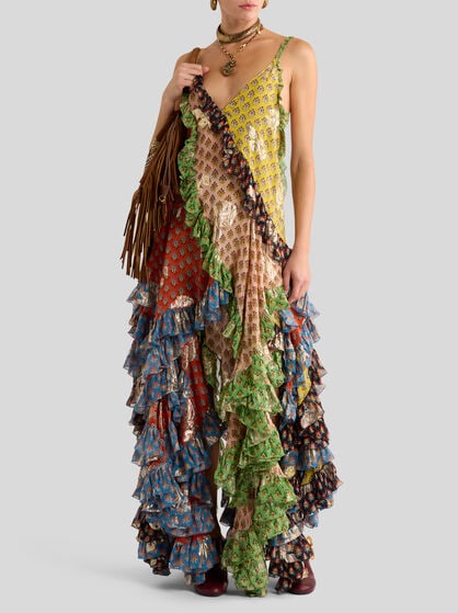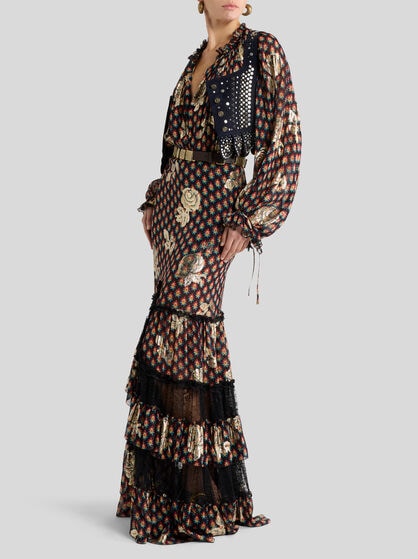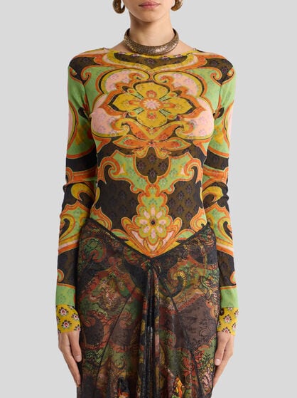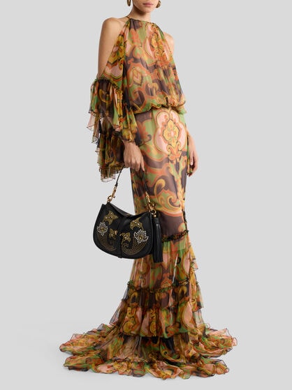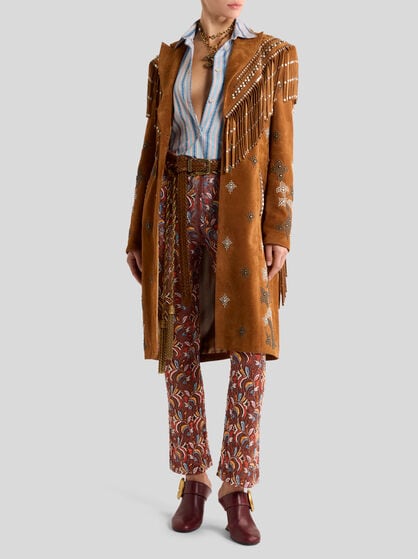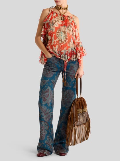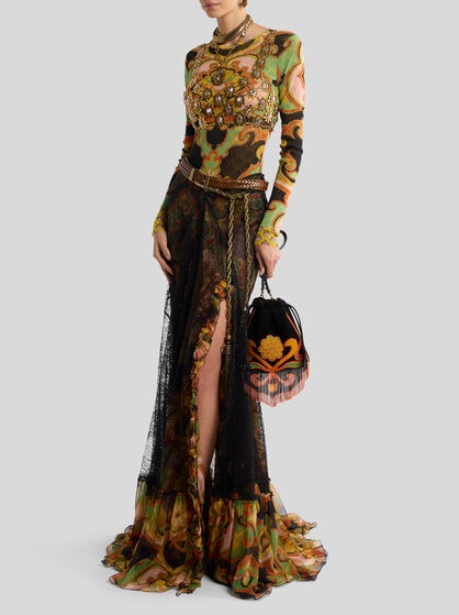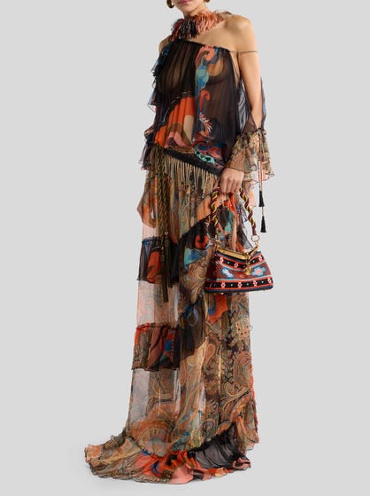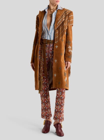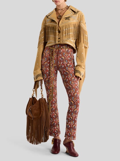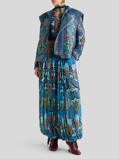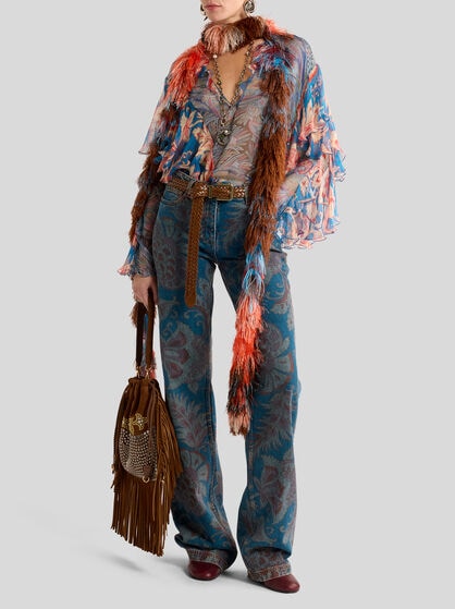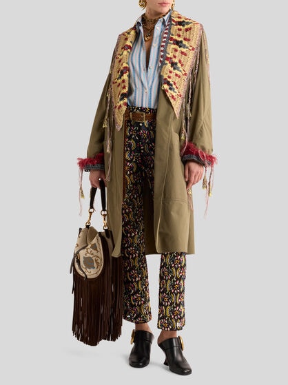 The ETRO women’s clothing collection encapsulates elegance and feminine style. Jacquard jackets in high quality fabrics are iconic in style with a feminine cut that highlights the silhouette, guaranteeing comfort and sophistication. The silk shirts with sinuous lines and well-finished details are coloured by Paisley designs while the palazzo trousers, with their width and fluid design, offer a feeling of lightness and style. Long dresses with floral prints capture the Maison’s quintessential style while short or wrap skirts featuring Pegaso embroidery add a touch of vivacity and dynamism to the wardrobe. Coats and outerwear with their elegant, contemporary design are a must-have. The Maison carefully selects high quality fabrics such as silk, cotton, linen, wool and cashmere. These fabrics make each garment in the collection an investment in style that lasts over time.