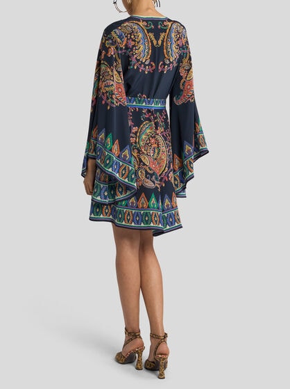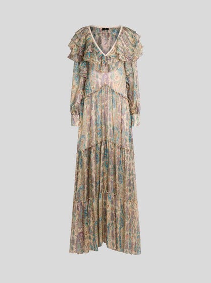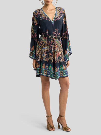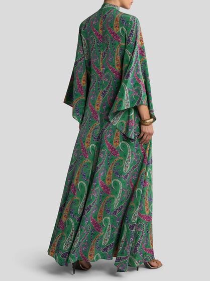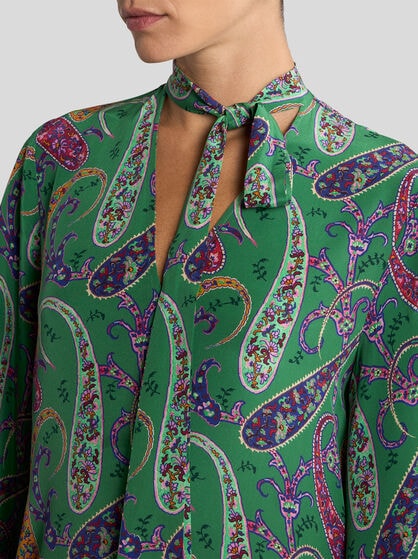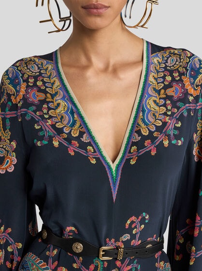 The dresses in the ETRO women’s collection are an authentic celebration of feminine beauty. Made in precious fibres such as silk and cotton, these garments elegantly come with floral prints, jacquard, patchwork and the iconic Paisley graphic, creating sophisticated and chic dresses. The collection offers a variety of models including long floral dresses that are perfect for special occasions, shirt dresses embellished by flounces to add a touch of elegance, and kimono models with an asymmetric cut, perfect as a passe-partout for any occasion. Ceremonial dresses, jumpsuits and evening dresses, elegant clothes that make every woman feel extraordinary. Explore our collection of women’s dresses, including the classic elegant sheath dress and tailored suits. Combine these dresses with your favourite accessories from handbags to the Saturno bag or Mini Vela bags.