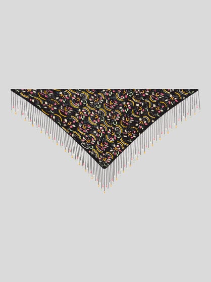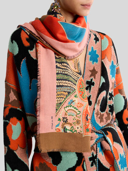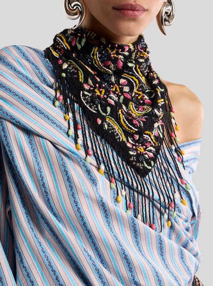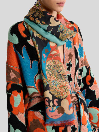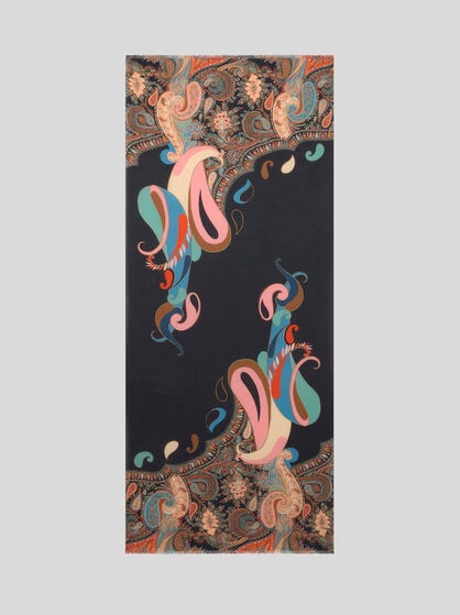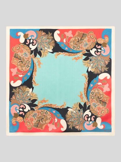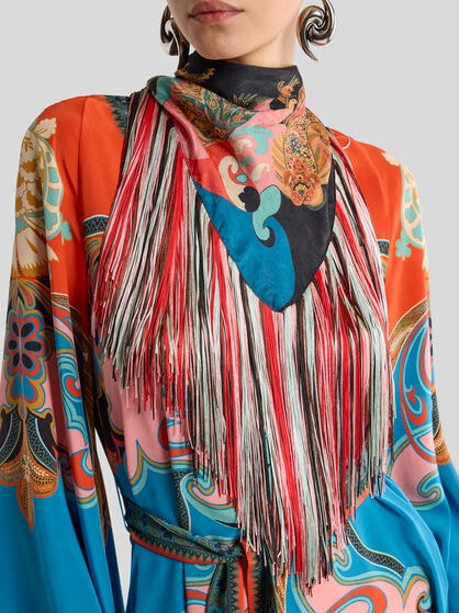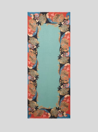 Explore la colección de fulares y pañuelos para mujer de ETRO. Para un look elegante y sofisticado, envuélvase en un fular de seda suave con un sofisticado estampado Paisley, combinándolo con un vestido en tonos pastel para darle un toque de vitalidad. Para un look casual chic, opte por un fular ligero y colorido para anudar al cuello o utilizar como diadema. Deje que su estilo se exprese mejor a través de los colores de su outfit, eligiendo un contraste atrevido o una combinación sutil. Ate un pañuelo de seda a su bolso favorito para darle un toque de elegancia y personalidad, transformando al instante un accesorio cotidiano en algo único. Experimente con diferentes técnicas de anudado para crear una variedad de estilos y adaptar cada pieza a su personalidad única. Renueve su armario con los accesorios icónicos de ETRO y experimente la versatilidad sin límites de estos fulares y pañuelos.